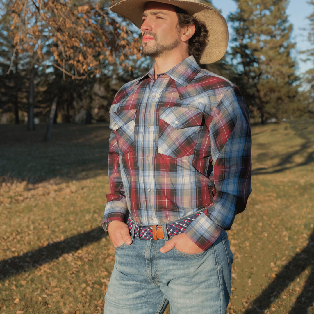 Men's Snap Plaid Shirt (Wine) - I30D02-06